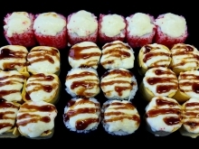 Унаги хосомаки, сяке хосомаки, чука хосомаки, хосомаки с крабом, хосомаки с креветкой в кляре, хосомаки с манго, хосомаки с тунцом (1220