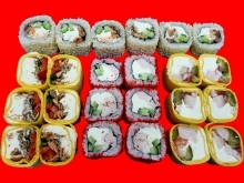 Сяке терияки, калифорния, фиеста, тортилья с креветкой, бурито. филадельфия с огурцом. (36шт)Специи заказываются отдельно.