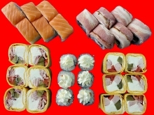Сяке филадельфия 2шт, филадельфия в беконе, чизмак с крабом, бурито, бурито с беконом