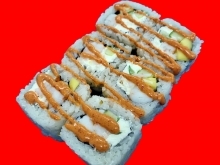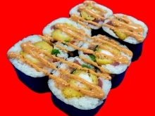 Рис, креветка в кляре, огурец, лосось, икра масаго, спайси соус
