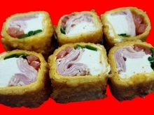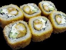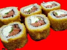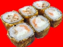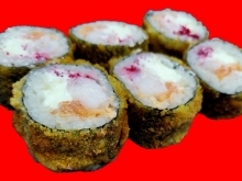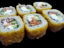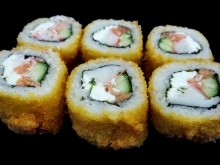 Рис, сыр, креветка варëная, лосось, икра масаго.