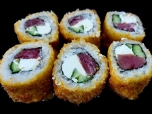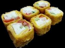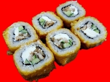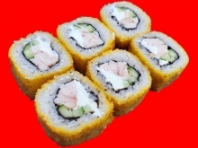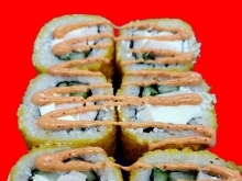 Рис, сыр, огурец, курица копчëная, кляре, спайси соус